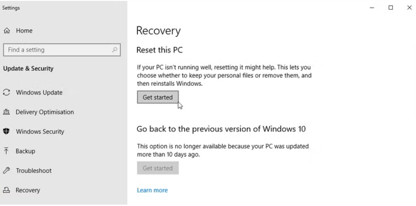 Chọn Get started dưới mục Reset this PC và làm theo hướng dẫn để cài đặt lại Windows.