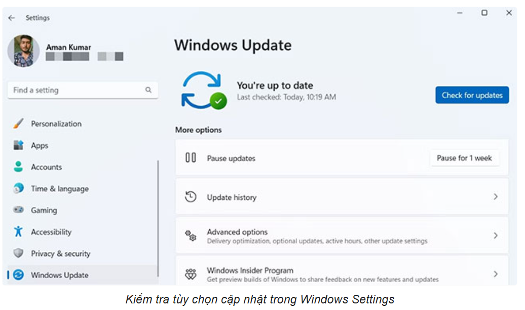 Bên cạnh việc cập nhật driver, hãy đảm bảo rằng Windows của bạn cũng đang được cập nhật phiên bản mới nhất. Mở Settings (Win + I), chọn Windows Update, và nhấn Check for Updates.