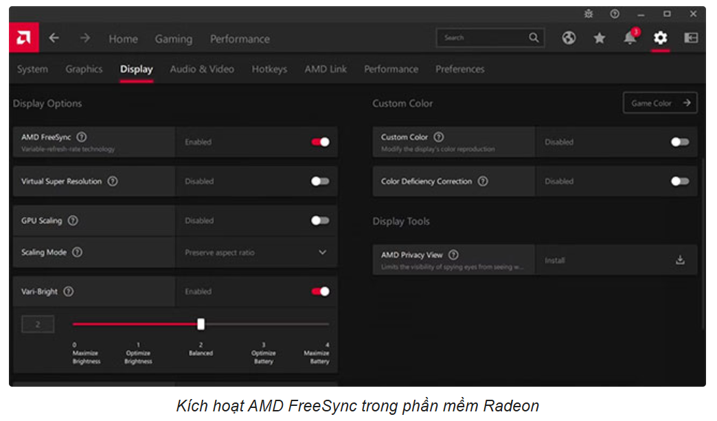 - AMD FreeSync: Bật tính năng này nếu màn hình của bạn hỗ trợ FreeSync để đồng bộ hóa tốc độ làm tươi màn hình với FPS trong game.
