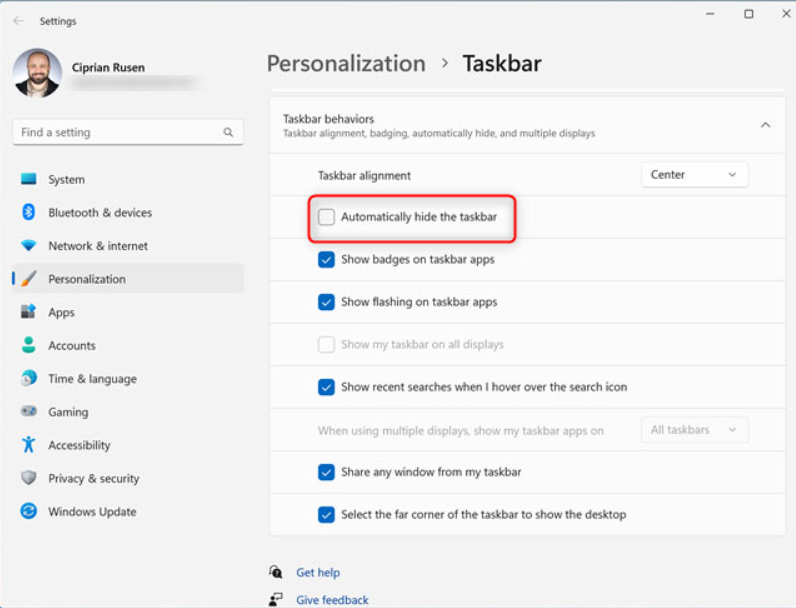 - Bạn cũng có thể vào Settings > Personalization > Taskbar, sau đó bỏ chọn tùy chọn Automatically hide the taskbar trong Taskbar Behaviors.
