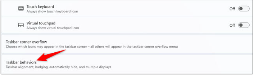 - Tiếp theo, trong cửa sổ Taskbar Settings, kéo xuống mục Taskbar Behaviors.