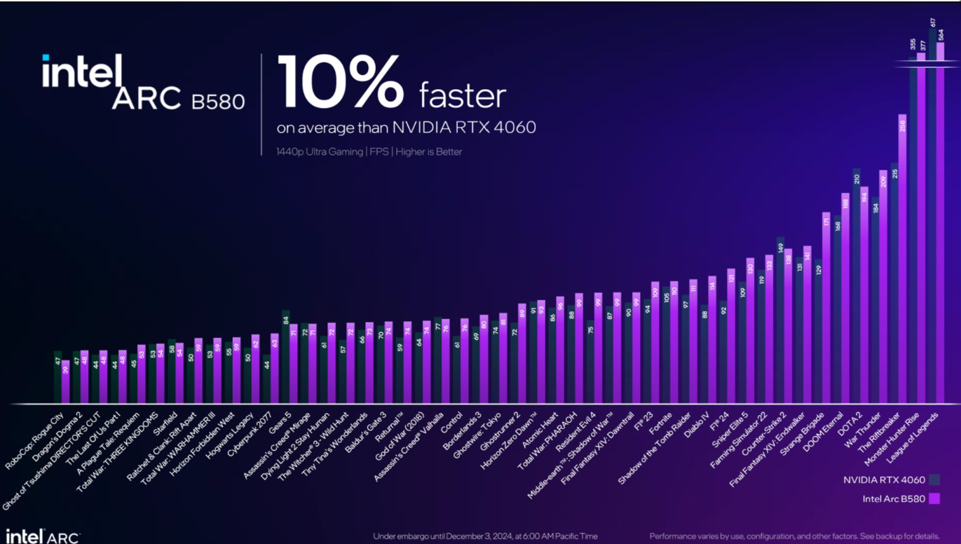 Intel khẳng định Arc B580 vượt trội hơn RTX 4060 khoảng 10% trong các tựa game như Cyberpunk 2077, Hogwarts Legacy, và The Witcher 3 ở độ phân giải 1440p và đồ họa mức Ultra. Đặc biệt, với 12GB VRAM, B580 có lợi thế rõ rệt trong các tựa game đòi hỏi dung lượng bộ nhớ cao.