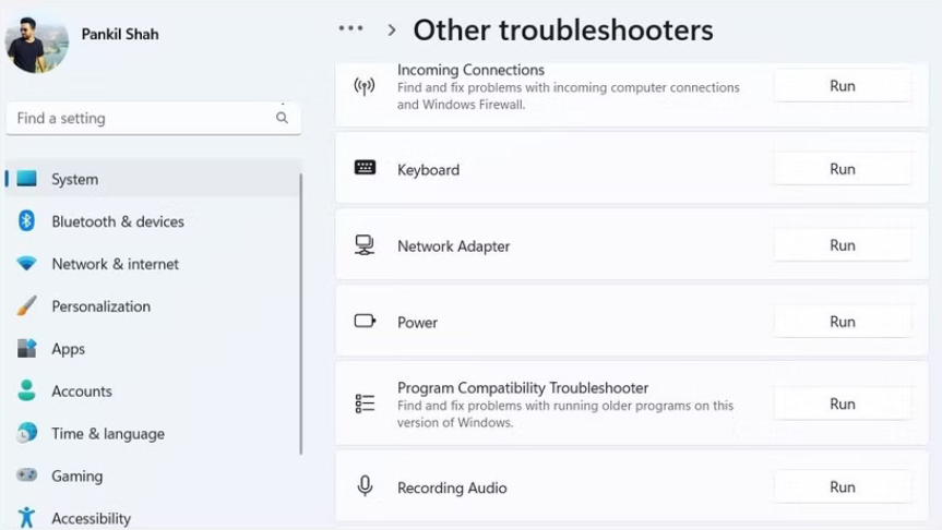 - Vào System > Troubleshoot > Other troubleshooters (hoặc Update & Security > Troubleshoot > Additional troubleshooters trên Windows 10).