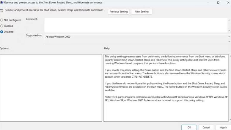 Cả Windows 10 và 11 đều cung cấp một tùy chọn để hạn chế người dùng khác truy cập vào các tùy chọn nguồn. Nếu tính năng này đã được bật, bạn sẽ không thể thấy các tùy chọn nguồn trong menu Start.