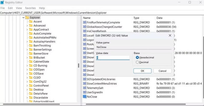 HKEY_CURRENT_USER\Software\Microsoft\Windows\CurrentVersion\Policies\Explorer - Nhấp đúp vào mục NoClose ở bên phải.