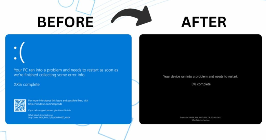 Từ phiên bản Windows 11 24H2, màn hình xanh BSoD sẽ được thay thế bằng “màn hình đen chết chóc” – Black Screen of Death. Ngoài sự thay đổi màu sắc, Microsoft cho biết: