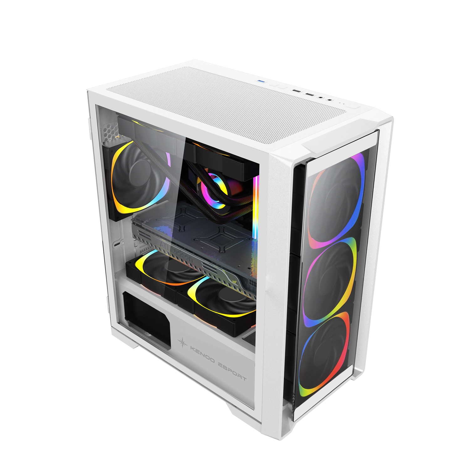 KENOO ESPORT MK500 có hệ thống làm mát 3 quạt 12cm mặt trước, 1 quạt 12cm mặt sau có đèn RGB cầu vồng cố định.