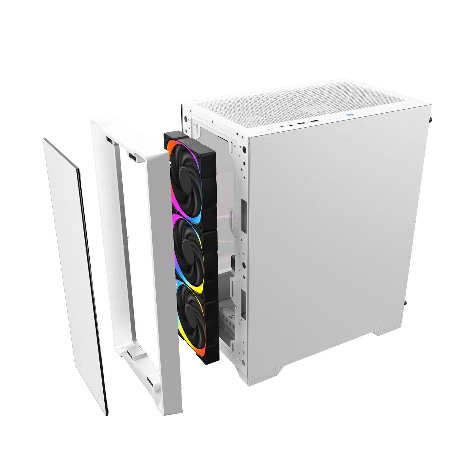 Vỏ Case chủ yếu sử dụng thép mạ SECC cách điện, nhiệt có độ dày 0.5mm kết hợp với mặt nhựa ABS và lưới kim loại nên rất chắc chắn và cứng cáp. Để show hết mọi linh kiện RGB rực rỡ bên trong máy, phần nắp hông của vỏ case được sử dụng kính cường lực trong suốt. Phần mặt trước cũng sử dụng kính trong suốt để lộ ra 3 Fan RGB đậm chất Game thủ.