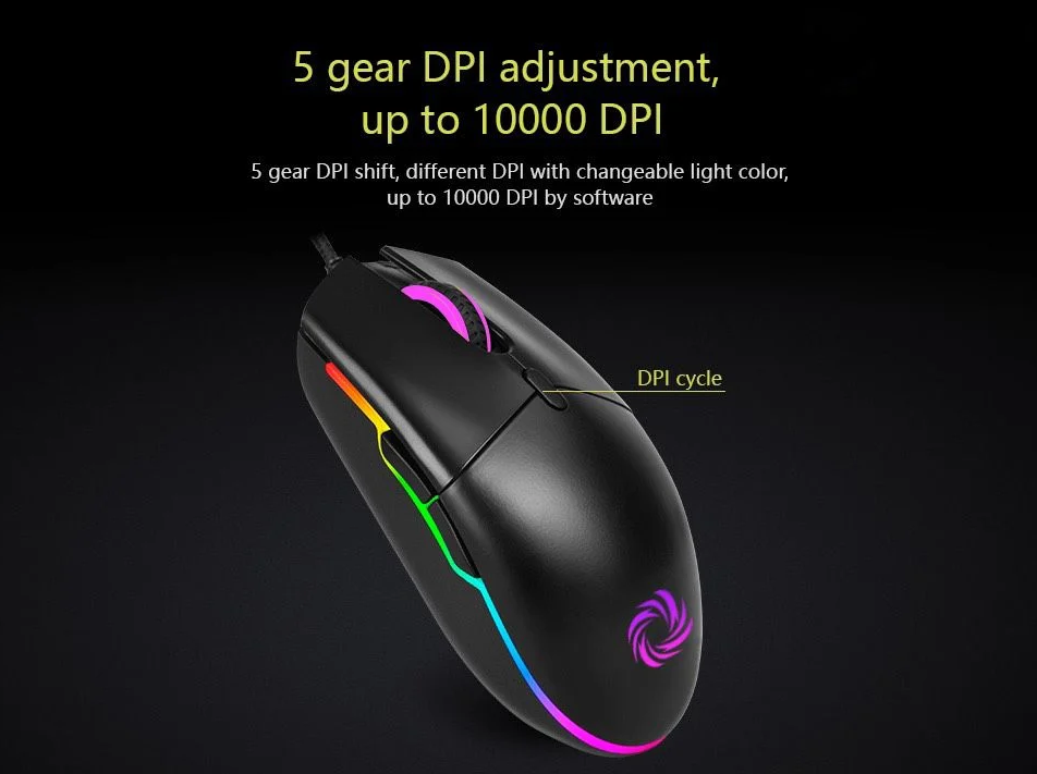 Điều chỉnh DPI 5 tốc độ: 1000/1600/2000/3200/5000 DPI. Ngoài ra, có thể tăng lên 10000 DPI bằng điều chỉnh phần mềm