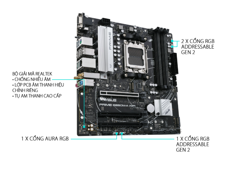 Trong tầm giá dưới 5 triệu đồng, ASUS PRIME B650M-A WIFI-CSM mang đến nhiều điểm mạnh vượt trội: hỗ trợ CPU Ryzen 7000, RAM DDR5, PCIe 5.0, WiFi 6 và LAN 2.5G – điều mà nhiều dòng mainboard khác cùng phân khúc chưa thể có được.