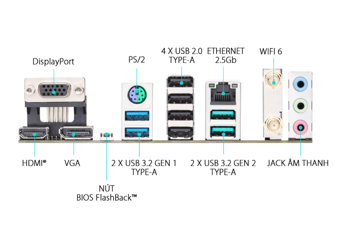| Cổng kết nối (Back Panel) | 2 x USB 3.2 Gen 2 ports (2 x Type-A) 2 x USB 3.2 Gen 1 ports (2 x Type-A) 4 x USB 2.0 ports (4 x Type-A) 1 x DisplayPort 1 x VGA port 1 x HDMI® port 1 x Wi-Fi Module 1 x Realtek 2.5Gb Ethernet port 3 x Audio jacks 1 x BIOS FlashBack™ button 1 x PS/2 Keyboard/Mouse combo port | |