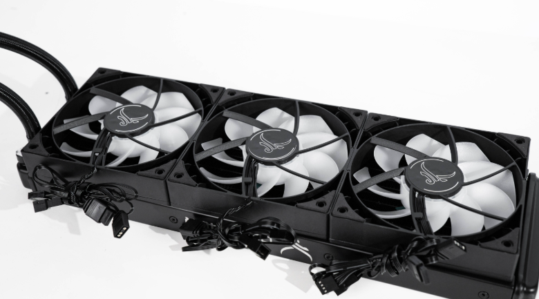 Tản nhiệt sử dụng 3 quạt 120 x 120 x 25 mm với vòng bi thủy lực, tốc độ quay 800 – 1800 RPM ±10%, tạo lưu lượng gió 58 CFM và áp suất gió 1.98 mmH₂O. Quạt có độ ồn thấp chỉ 11 – 27 dBA, đảm bảo làm mát hiệu quả mà không gây tiếng ồn lớn.