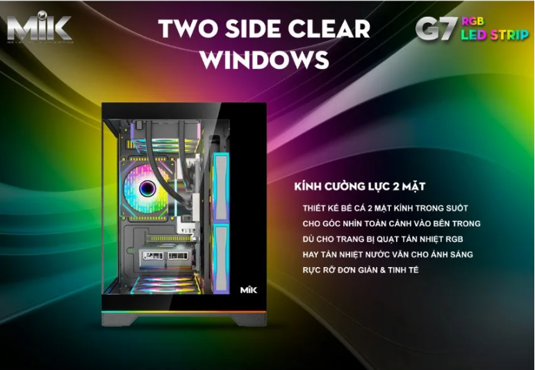 MIK G7 LED Strip BLACK là mẫu vỏ máy tính Mini Tower nổi bật trong phân khúc phổ thông – nâng cao, sở hữu thiết kế hiện đại, đậm chất gaming với mặt kính cong nguyên khối, màn LCD hiển thị thông số CPU/VGA, và không gian rộng rãi cho phần cứng cao cấp. Với khả năng hỗ trợ tản nhiệt nước 360mm, VGA dài 400mm, và hệ thống lắp fan đa điểm linh hoạt, MIK G7 là lựa chọn hoàn hảo cho những ai muốn xây dựng một bộ máy vừa đẹp, vừa mạnh.
